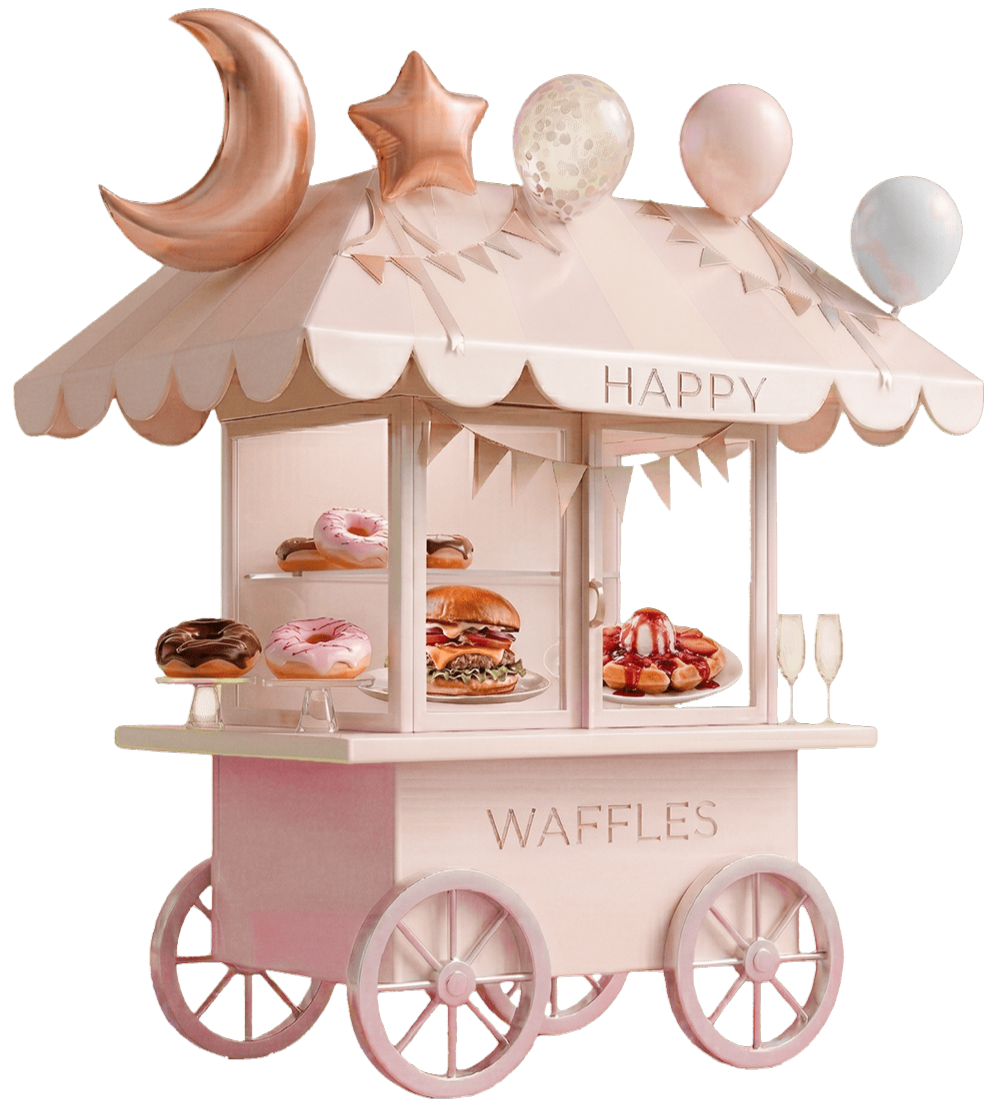 Estaciones de Dulces y Snacks Nuestros famosos waffles que no tienen comparación , crepes, helados, donas y barras de snacks para todos los gustos.